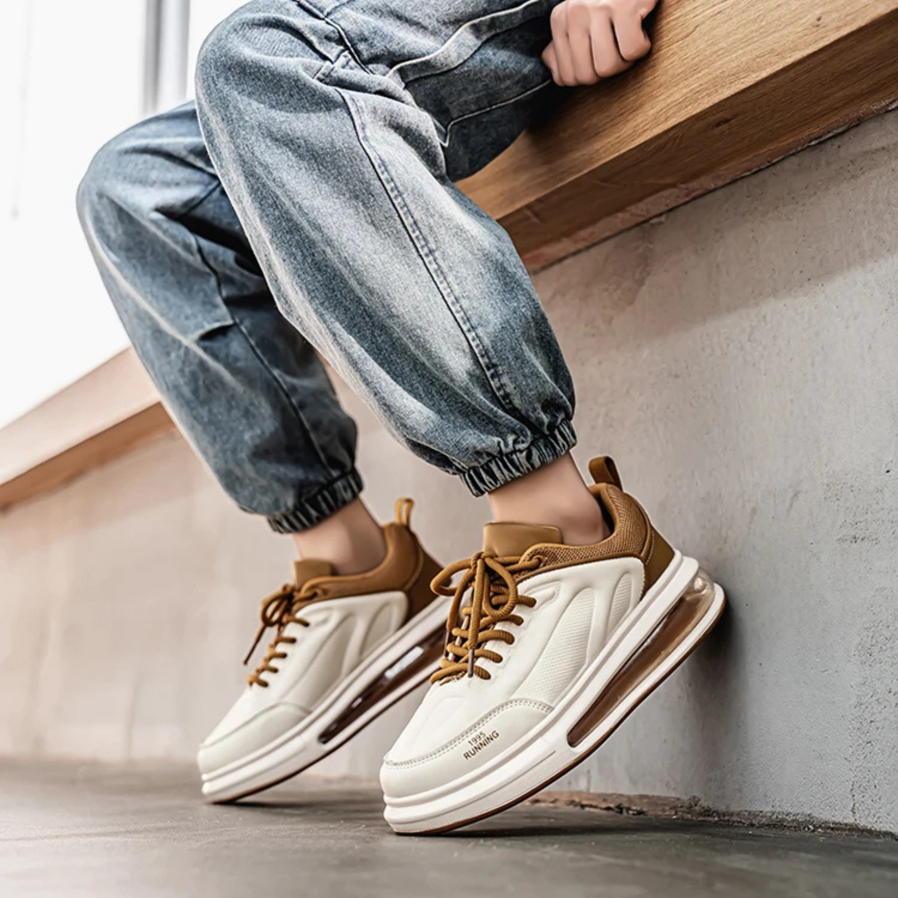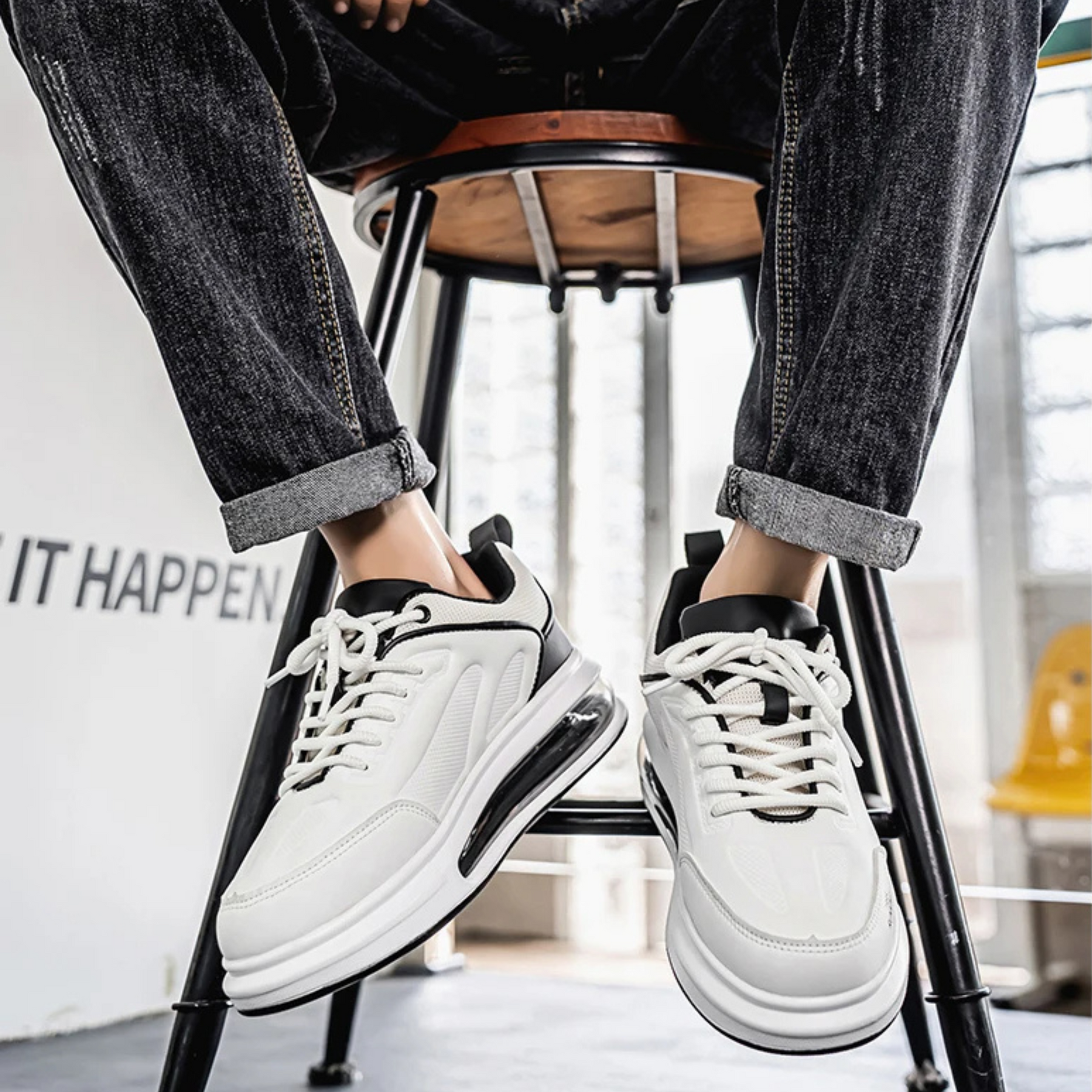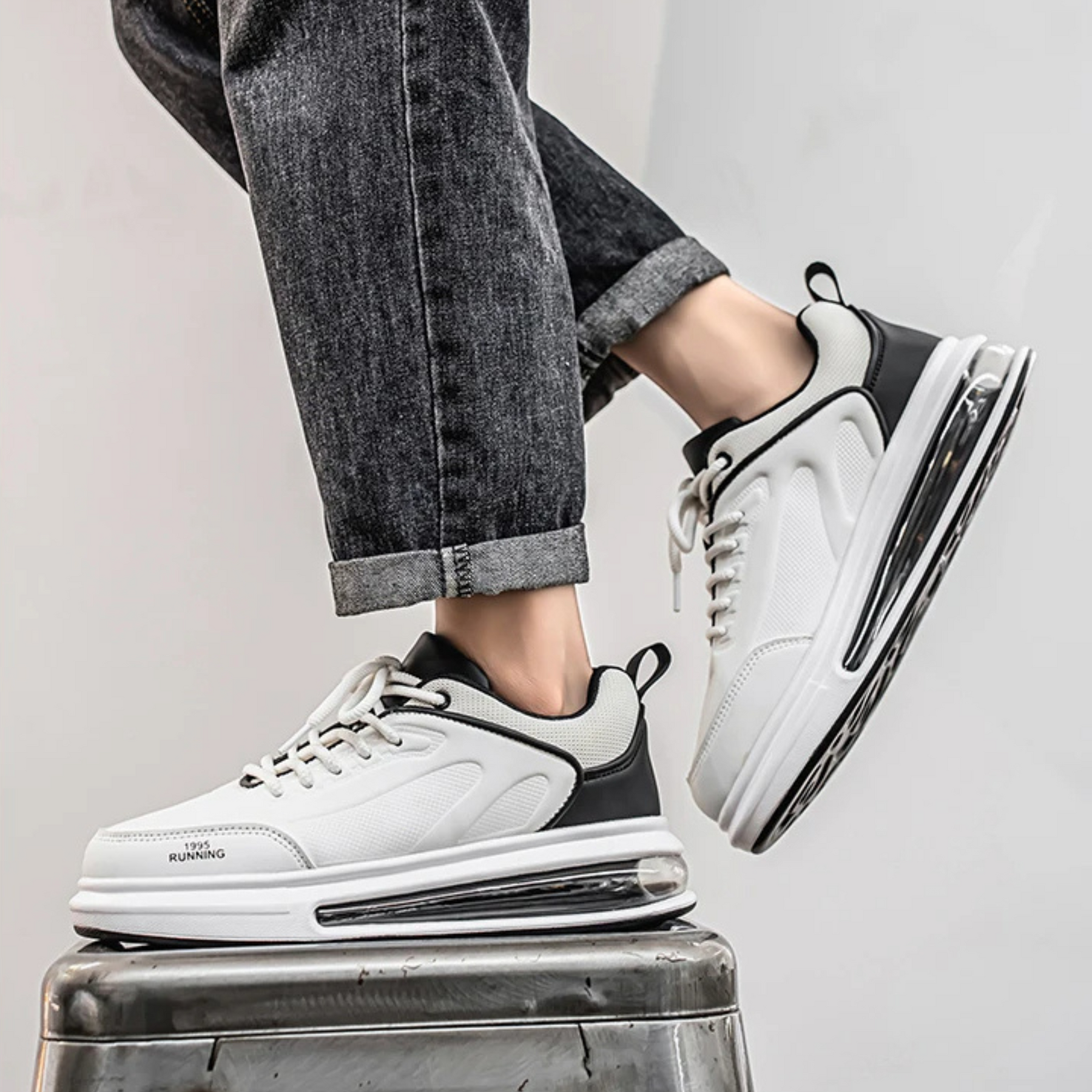 Designed to master every surface, these next-generation runners combine sculptural athletic design with uncompromising comfort. A full-length air-cushion sole delivers gravity-defying rebound, while precision leather overlays and a breathable mesh upper ensure a dynamic, foot-hugging fit built for motion and style.